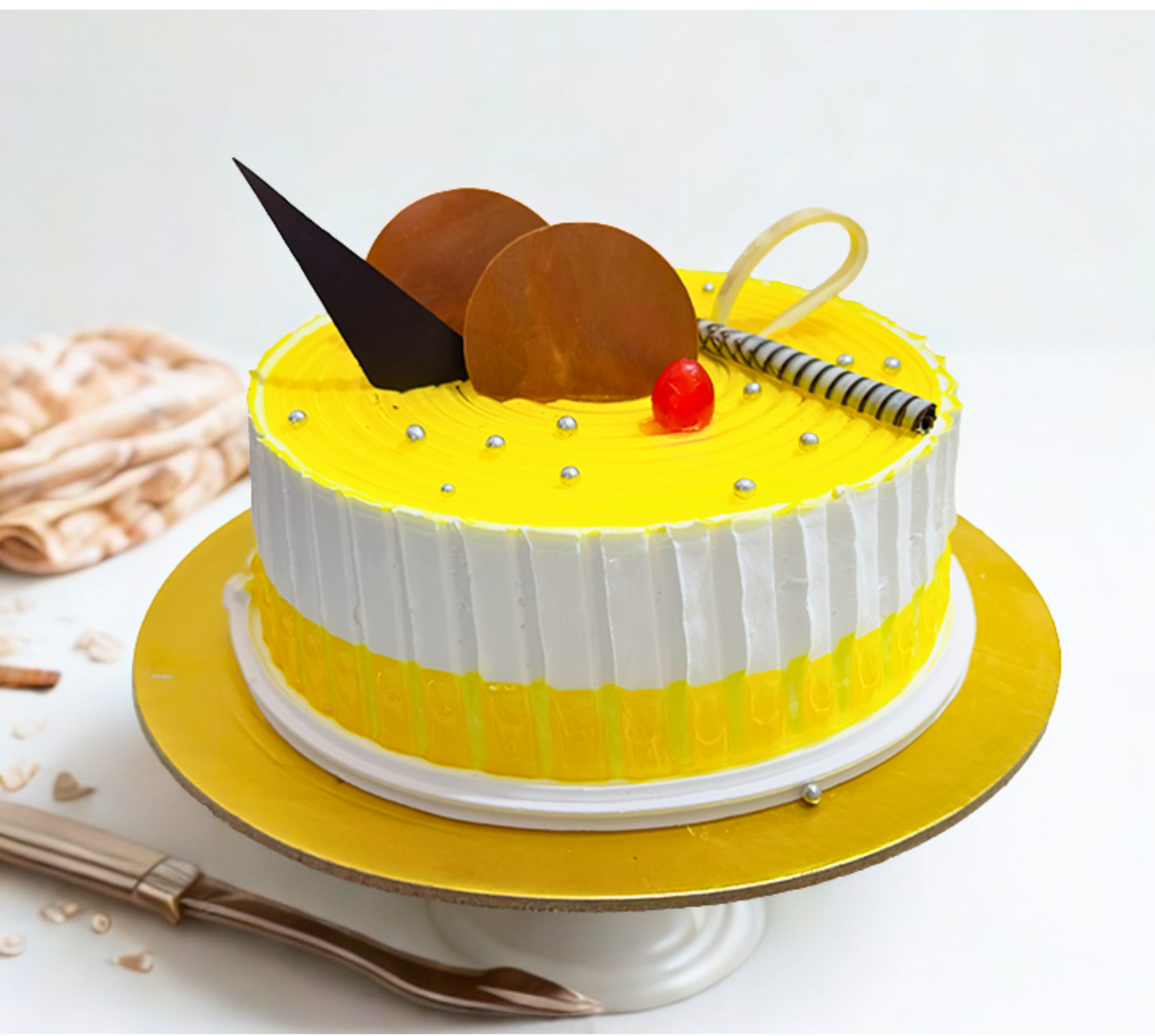 Bring a touch of freshness to your celebration with our Fresh Pineapple Cream Cake, a light and refreshing treat loved by all age groups. Made with soft vanilla sponge layered with smooth pineapple-flavoured cream and juicy pineapple bites, this pure veg cake is topped with a creamy frosting and garnished with cherries for a perfect tropical delight.